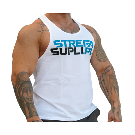 Tank top STREFASUPLI.PL to połączenie wygody, funkcjonalności i sportowego charakteru stworzone z myślą o osobach aktywnych. Wykonany z miękkiej, oddychającej bawełny, zapewnia komfort oraz pełen zakres ruchu podczas treningu. Mocno wycięty krój nadaje mu dynamiczny wygląd i pozwala wyeksponować umięśnioną sylwetkę, podkreślając ramiona, klatkę piersiową i plecy. To idealny wybór dla tych, którzy chcą łączyć styl z funkcjonalnością zarówno na siłowni, jak i poza nią.