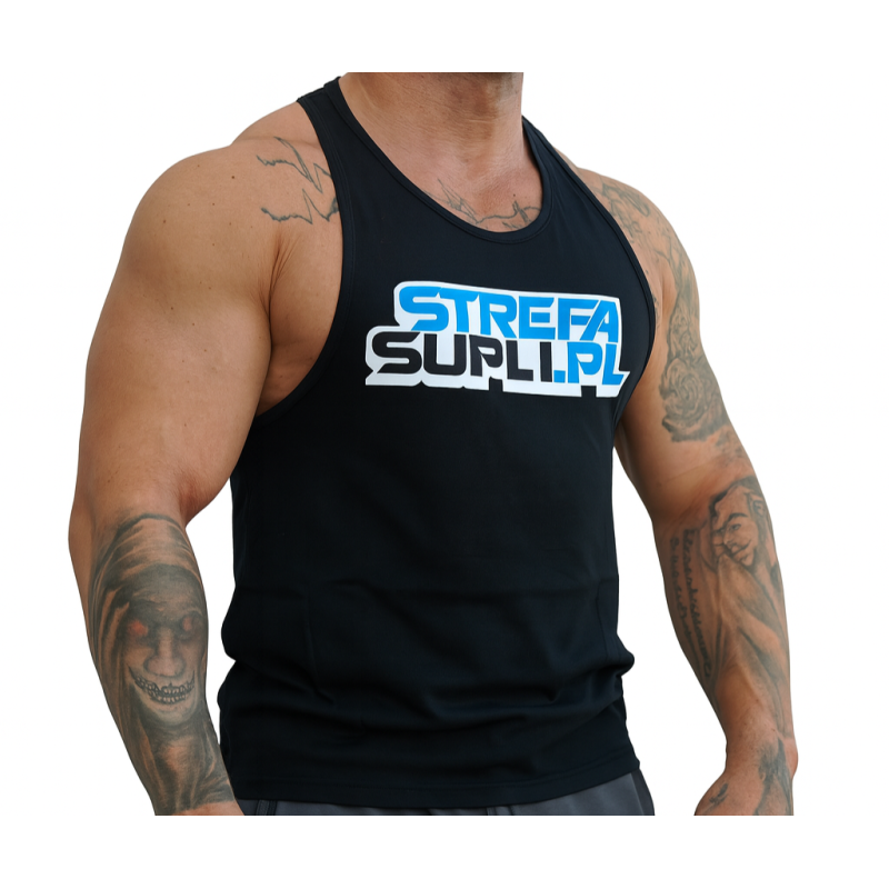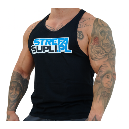 Tank top STREFASUPLI.PL to połączenie wygody, funkcjonalności i sportowego charakteru stworzone z myślą o osobach aktywnych. Wykonany z miękkiej, oddychającej bawełny, zapewnia komfort oraz pełen zakres ruchu podczas treningu. Mocno wycięty krój nadaje mu dynamiczny wygląd i pozwala wyeksponować umięśnioną sylwetkę, podkreślając ramiona, klatkę piersiową i plecy. To idealny wybór dla tych, którzy chcą łączyć styl z funkcjonalnością zarówno na siłowni, jak i poza nią.