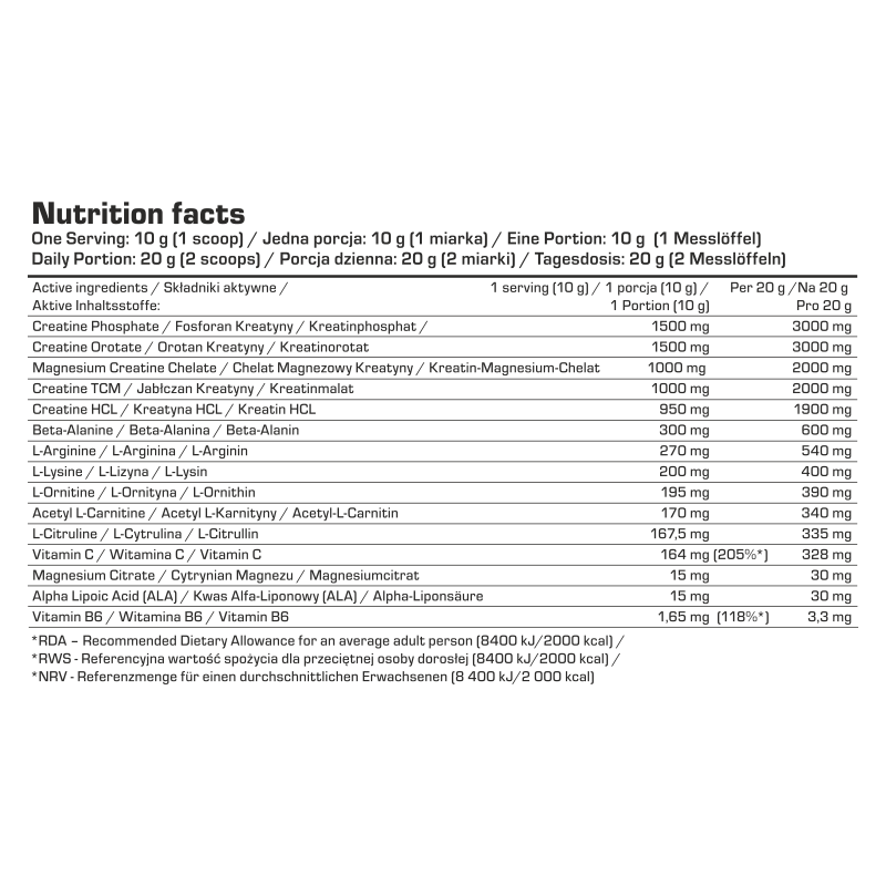 Aminokwas endogenny. Bezpośrednio zwiększa produkcję tlenku azotu (NO) jeszcze mocniej wpływając na ukrwienie i waskularyzację (użylenie). Dzięki solidnej dawce tego aminokwasu będziesz odczuwał dodatkową pompę mięśniową, a Twoje żyły będą jeszcze bardziej widoczne.