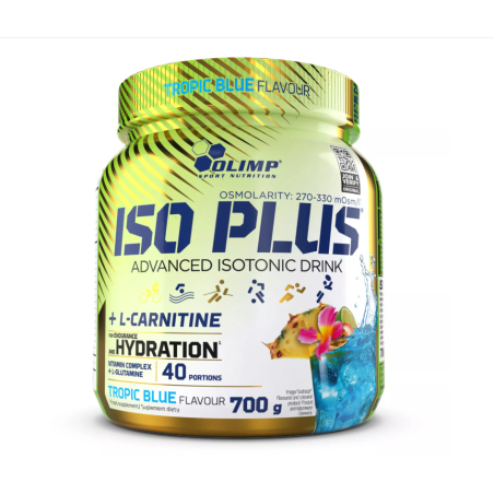 Olimp Iso Plus to starannie skomponowany koncentrat w proszku do przyrządzania napoju izotonicznego, który intensywnie i w maksymalnym stopniu nawadnia organizm, przywracając mu równowagę wodno-elektrolitową podczas i po wysiłku. Specjalna receptura izotoniczna została wzbogacona L-karnityną i L-glutaminą, które dodatkowo wspomagają organizm w trakcie długotrwałego wysiłku fizycznego. Dodatek witamin uzupełnia zwiększoną ich utratę z organizmu w trakcie treningu.