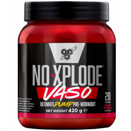 BSN N.O.-Xplode Vaso to suplement diety w formie proszku, który zawiera kompleksowy miks składników aktywnych mających na celu zwiększenie wytrzymałości, siły i intensywności treningu. Produkt ten zawiera między innymi beta-alaninę, cytrulinę, L-argininę, kofeinę. BSN N.O.-Xplode Vaso ma za zadanie wspomóc intensywność i skuteczność treningu, a także zwiększyć przepływ krwi i dostarczenie składników odżywczych do mięśni. Produkt przeznaczony jest dla osób aktywnych fizycznie, trenujących siłowo i wytrzymałościowo.
