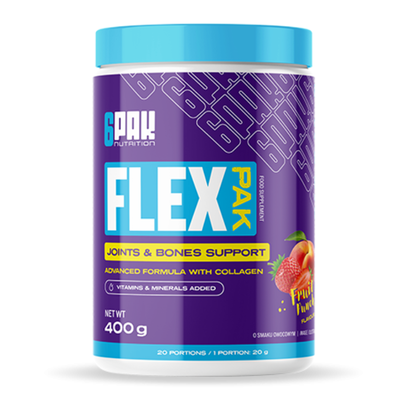 6PAK Flex Pak 400g Mocne Stawy Kości Zaawansowana formuła, której poszczególne składniki maja znaczenie dla układu ruchu. To produkt, który świetnie sprawdzi się dla wszystkich, nie tylko dla osób intensywnie trenujących.