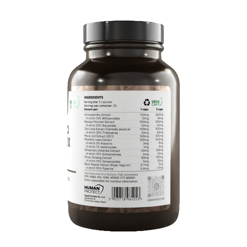 SKŁADNIKI: Składnik kapsułki: Celuloza, Ekstrakt z Ashwagandhy (Withania Somnifera; w tym 10% witanolidów), Ekstrakt z Bacopa Monnieri (w tym 20% Bakozydów), Ekstrakt z Gotu kola (Centella asiatica; w tym 20% Triterpenów), Ekstrakt z korzenia Maca (20% :1), ekstrakt z Rhodiola rosea (w tym 3% rozawin, 1% salidrozydów), ekstrakt z cytryńca chińskiego (w tym 10% schizandryny), ekstrakt z żeń-szenia Panax (Panax ginseng C.A. Meyer; w tym 10% ginsenoisdes), ekstrakt z czarnego pieprzu ( Piper Nigrum; z czego 95% Piperyna).
