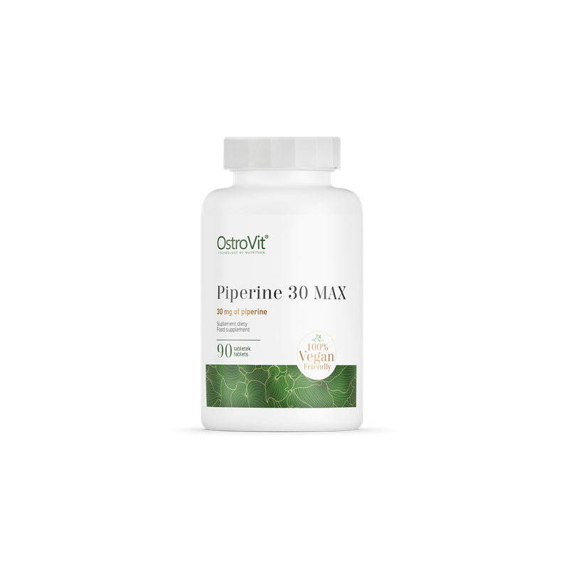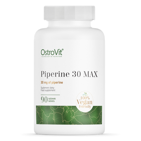 OstroVit Piperyna 30 mg MAX to ekstrakt z owoców czarnego pieprzu zawierający aż 95% piperyny. Suplement dostępny jest w formie wygodnych w spożyciu tabletek, które wspierają pracę wielu układów. Piperyna może pomagać w odchudzaniu, a także charakteryzuje się silnymi właściwościami oczyszczającymi. Dodatkowo reguluje poziom przyswajania innych cennych składników odżywczych.