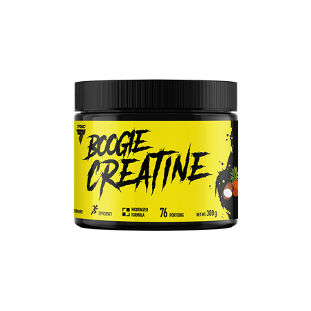 TREC BOOGIE CREATINE to suplement diety zawierający kreatynę, która zwiększa wydolność fizyczną w przypadku następujących po sobie krótkich, bardzo intensywnych ćwiczeń fizycznych. Korzystny efekt występuje w przypadku spożywania 3 g kreatyny dziennie.