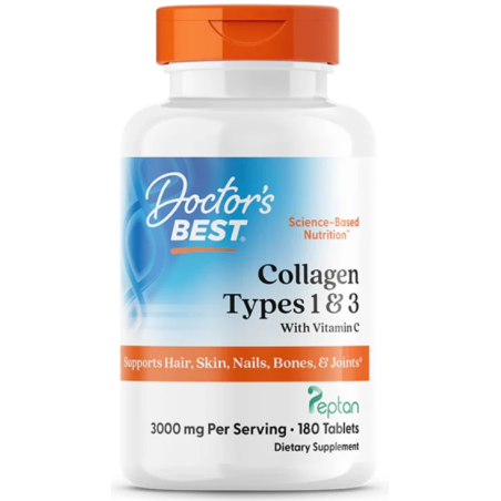 Doctor’s Best Collagen Types 1 & 3 to wysokiej jakości suplement diety zawierający hydrolizowany kolagen typu I i III, który wspiera zdrowie skóry, włosów, paznokci, stawów i kości. Produkt został wzbogacony o witaminę C, która jest niezbędna do syntezy kolagenu w organizmie.