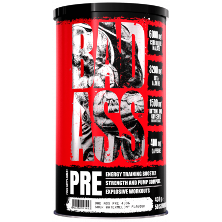 BAD ASS® PRE 438 g to formuła przedtreningowa w proszku, opracowana dla osób trenujących siłowo i wytrzymałościowo — stworzona by wspierać intensywność sesji i poprawić wydolność treningową.