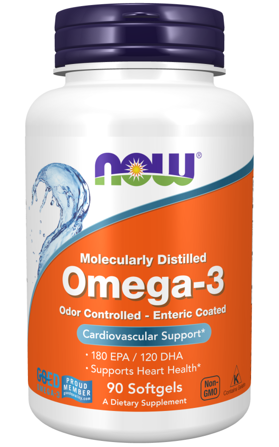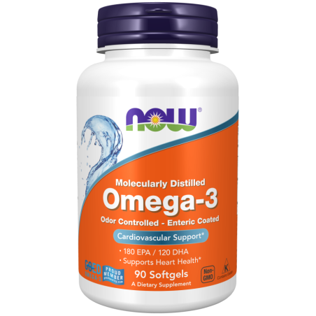 Now Foods Omega-3 Molecularly Distilled & Enteric Coated 90 to wysoko oczyszczony olej rybny z powłoką entericzną — kapsułki dostarczają omega-3 (EPA i DHA) w formule przyjaznej dla układu pokarmowego i o zmniejszonym posmaku ryby.
