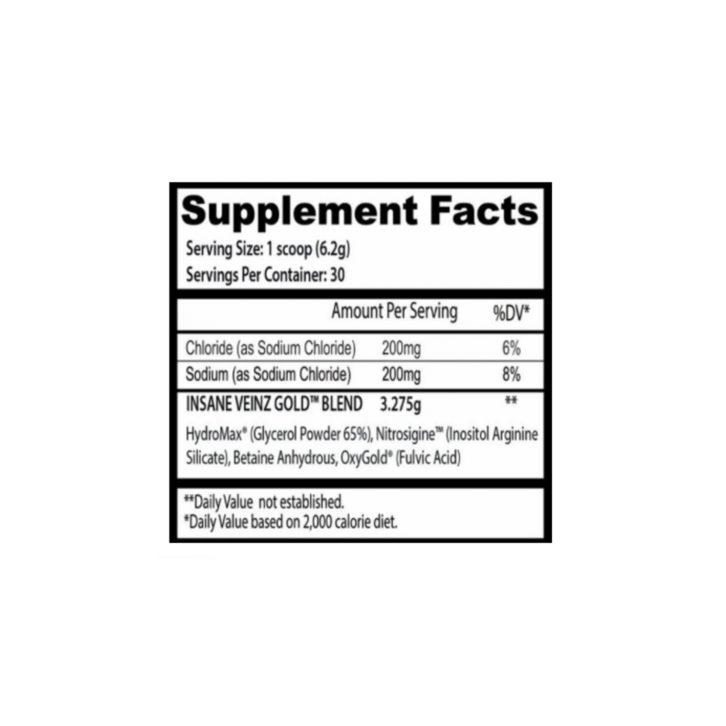 INSANE VEINZ Gold PREWORKOUT 180 g — wysokiej klasy formuła do pompy mięśniowej bez stymulantów, zawierająca HydroMax®, Nitrosigine® i OxyGold®. Idealna dla osób aktywnych, które chcą maksymalnego ukrwienia i lepszej wydajności treningowej bez pobudzenia.
