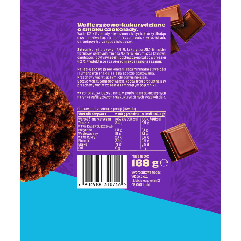 DZIK® Wafle Kukurydziane Low-Fat to niskotłuszczowa propozycja dla osób, które chcą cieszyć się chrupiącą przekąską bez nadmiaru kalorii. Wafle powstają na bazie kukurydzy — lekkie, delikatne i o przyjemnej konsystencji, która sprawia, że są idealne zarówno solo, jak i w towarzystwie ulubionych dodatków. Produkt świetnie wpisuje się w aktywny styl życia, a jego uniwersalny charakter sprawia, że pasuje do różnych sytuacji: jako szybka przekąska w pracy, dodatek do lunchu, element obiadu lub baza pod dipy i pasty. DZIK® Wafle Kukurydziane Low-Fat to połączenie prostego składu i smaku, który zadowoli każdego fana zdrowych, chrupiących przekąsek.