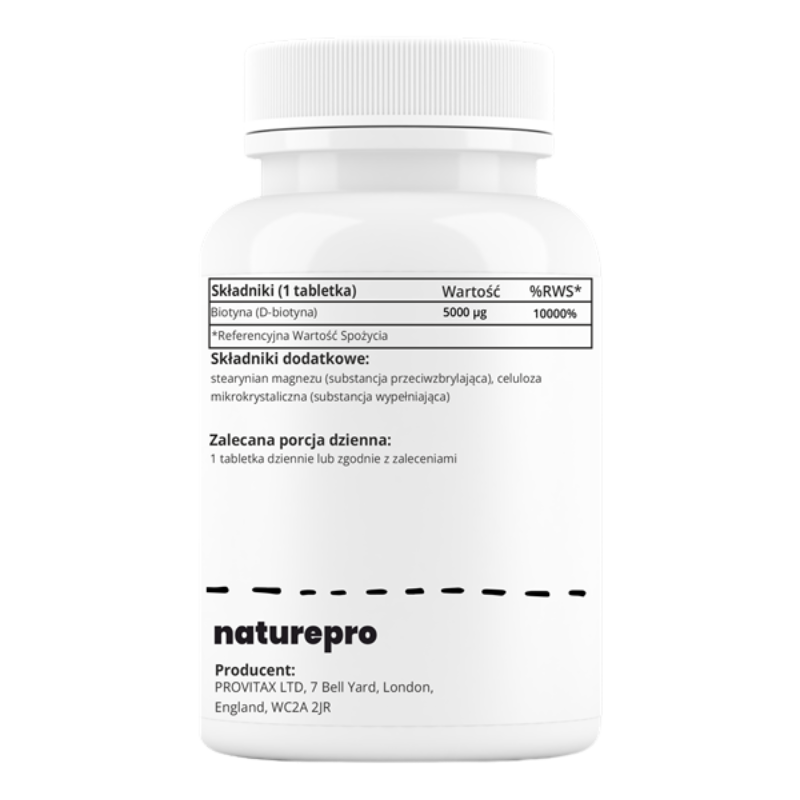 NaturePro Biotyna 5000 mcg to suplement diety z wysoką dawką biotyny — witaminy o szerokim spektrum działania, często wybierany przez osoby dbające o kondycję włosów, skóry i paznokci oraz optymalną suplementację codzienną.