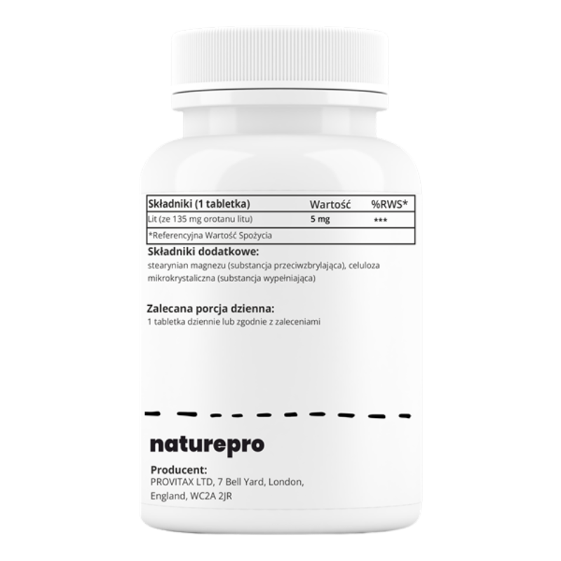 NaturePro Orotan Litu to suplement diety zawierający orotan litu w tabletce — wygodna forma mikroelementu, który może być stosowany jako element codziennej suplementacji przez osoby aktywne i dbające o świadome uzupełnienie diety.