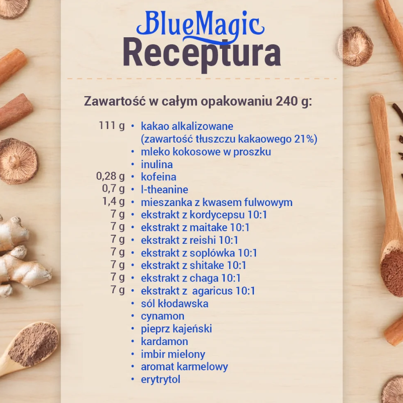 Blue Magic Kakao to zaawansowana mieszanka naturalnego kakao instant, wzbogacona o grzyby adaptogenne oraz kwas fulwowy, tworząca produkt, który działa jak coś więcej niż zwykłe kakao. Dzięki połączeniu starannie dobranych składników powstała formuła, która może wspierać adaptację organizmu na codzienne obciążenia, wspomagać naturalne procesy odpornościowe oraz dodawać energii i klarowności umysłu. Naturalne kakao dodaje aromatu i przyjemności smaku, a adaptogenne grzyby oraz kwas fulwowy tworzą synergiczne wsparcie funkcjonalne - idealne do porannego napoju, codziennego rytuału lub jako element świadomej suplementacji.