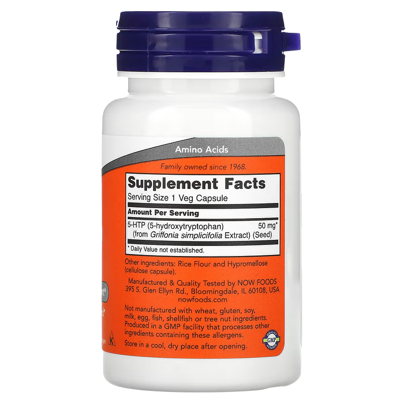 NOW Foods 5-HTP to suplement diety oparty na 5-hydroksytryptofanie (5-HTP) – naturalnym związku pośrednim pomiędzy aminokwasem tryptofanem a serotoninowym układem neuroprzekaźników. 5-HTP pozyskiwany jest z nasion afrykańskiej rośliny Griffonia simplicifolia, co sprawia, że formuła jest bogata i dobrze tolerowana przez organizm. Produkt został przygotowany z myślą o osobach dorosłych, które chcą wspierać swoje codzienne samopoczucie i równowagę wewnętrzną w kontekście życia w szybkim tempie, wymagającego środowiska czy wzmożonych obciążeń. Każda kapsułka dostarcza 50 mg 5-HTP w postaci wegańskiej kapsułki, co umożliwia łatwą i wygodną suplementację bez kofeiny i bez składników odzwierzęcych.