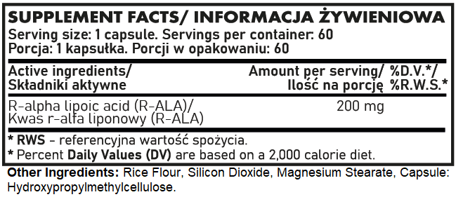 Składniki: kwas r-alfa liponowy, substancja wypełniająca: mąka ryżowa, substancje przeciwzbrylające: dwutlenek krzemu, stearynian magnezu, kapsułka: hydroksypropylometyloceluloza. |