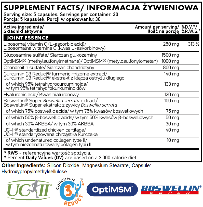 Składniki: siarczan glukozaminy, OptiMSM® metylosulfonylometan, siarczan chondriotyny, kwas L-askorbinowy (witamina C), Curcumin C3 Reduct® ekstrakt z kłącza ostryżu długiego (Curcuma longa L.) w tym 95% tetrahydrokurkuminoidów, kwas hialuronowy (z hialuronianu sodu), Boswellin® Super ekstrakt z żywicy Boswellia serrata w tym 75% kwasów bosweliowych, 50% kwasów β-bosweliowych, 30% AKBBA, substancje przeciwzbrylające: dwutlenek krzemu, stearynian magnezu, kapsułka: hydroksypropylometyloceluloza, UC-II® standaryzowana chrząstka kurczaka w tym niezdenaturowany kolagen typu II. |