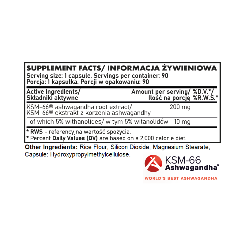 Składniki: KSM-66® ekstrakt z korzenia ashwagandhy (Withania somnifera L. Dunal) w tym 5% witanolidów, substancja wypełniająca: mąka ryżowa, substancje przeciwzbrylające: dwutlenek krzemu, stearynian magnezu, kapsułka: hydroksypropylometyloceluloza. |