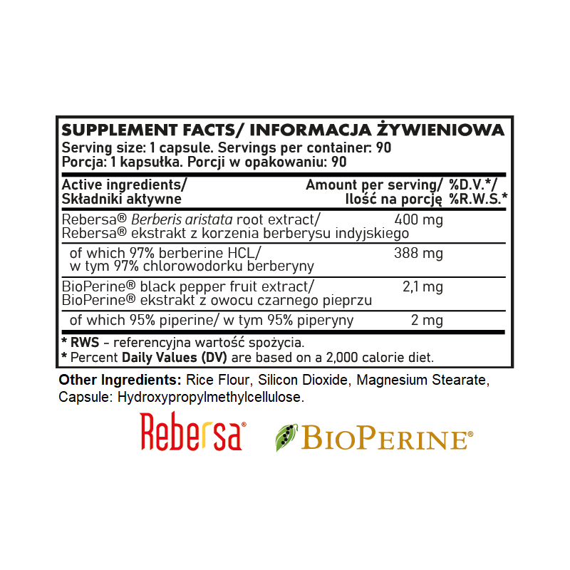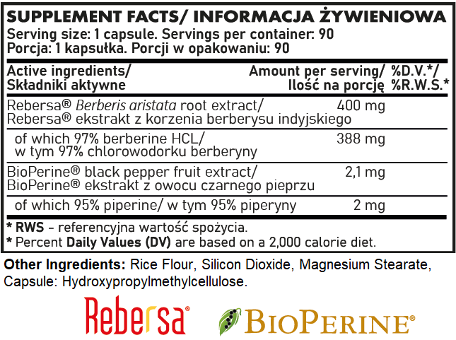Składniki: Rebersa® ekstrakt z korzenia berberysu indyjskiego (Berberis aristata) w tym 97% chlorowodorku berberyny, substancja wypełniająca: mąka ryżowa, substancje przeciwzbrylające: dwutlenek krzemu, stearynian magnezu, kapsułka: hydroksypropylometyloceluloza, BioPerine® ekstrakt z owocu czarnego pieprzu (Piper nigrum L.) w tym 95% piperyny. |