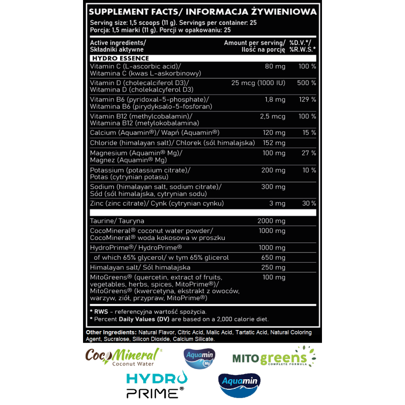 Składniki: tauryna, Aquamin® (Lithothamnion sp.), Aquamin® Mg cytrynian magnezu, CocoMineral® woda kokosowa w proszku, HydroPrime® w tym glicerol 65%, cytrynian sodu, cytrynian potasu, regulator kwasowości: kwas cytrynowy, kwas jabłkowy, kwas winowy, naturalny aromat, sól himalajska, MitoGreens® (kwercetyna, ekstrakt z owoców, warzyw, ziół, przypraw, MitoPrime® l-ergotioneina), kwas L-askorbinowy (witamina C), substancja słodząca: sukraloza, cholekalcyferol D3 (witamina D), cytrynian cynku, pirydyksalo-5-fosforan (witamina B6), metylokobalamina (witamina B12), naturalne barwniki: spirulina (dla smaku Green Apple), czerwień buraczana (dla smaku Grape Nectar). |
