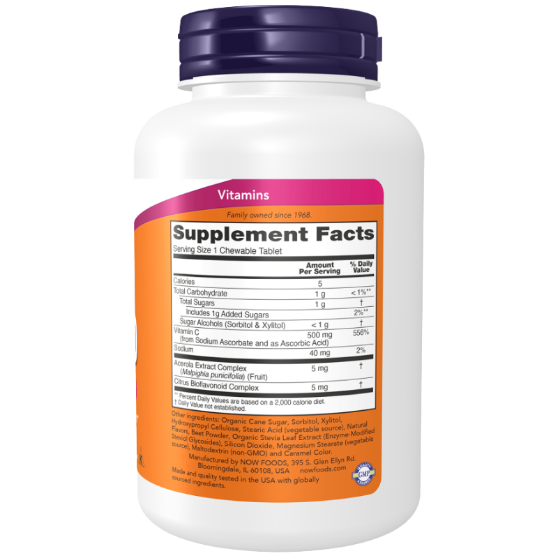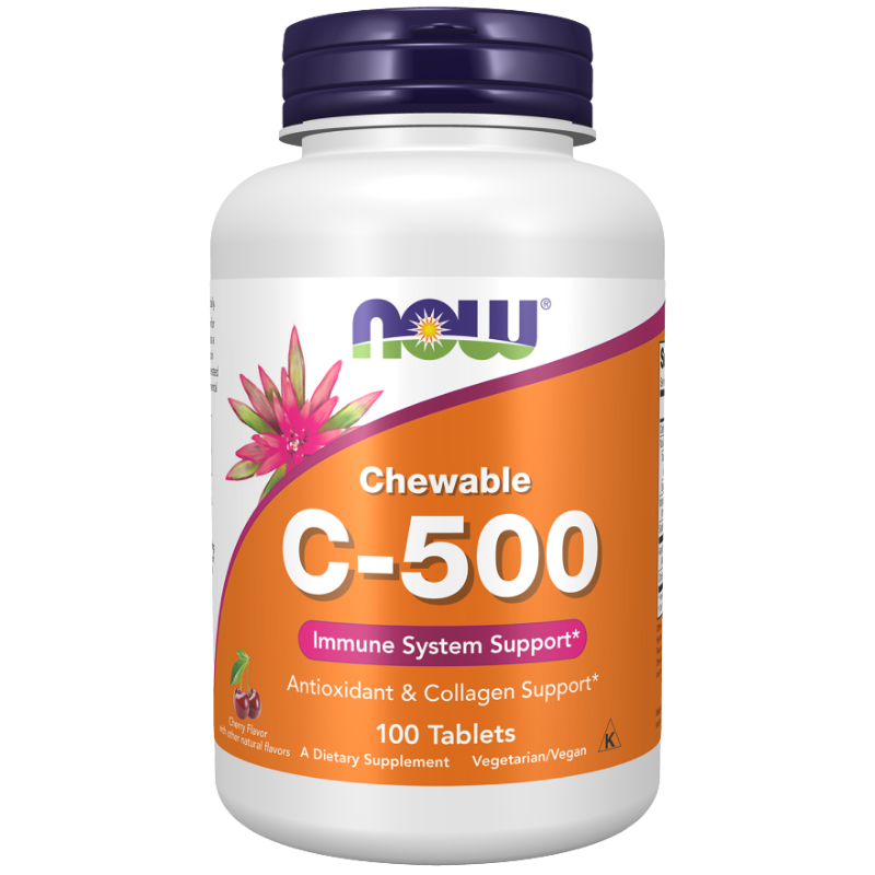 NOW Foods Witamina C-500 do ssania to suplement diety zawierający wysoką dawkę 500 mg witaminy C w każdej tabletce, który wspiera naturalne procesy odpornościowe i funkcje antyoksydacyjne organizmu.