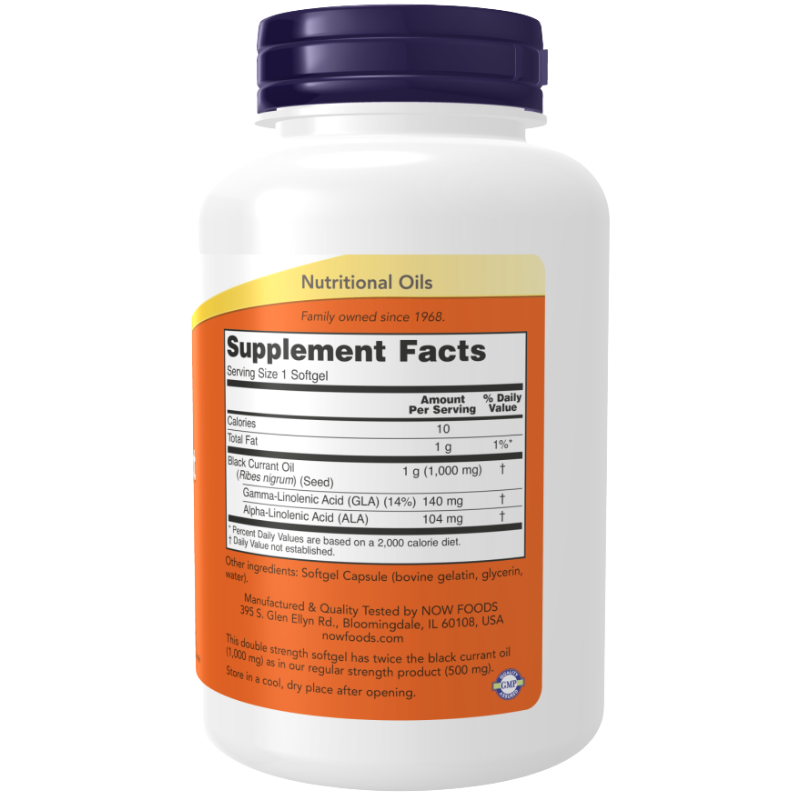 NOW Foods Black Currant Oil to starannie przygotowany suplement diety w formie miękkich kapsułek zawierających olej pozyskiwany z nasion czarnej porzeczki. Produkt oferuje podwójną dawkę oleju w porównaniu do standardowej formuły, dzięki czemu dostarcza znaczącą ilość bioaktywnych kwasów tłuszczowych, w tym gamma-linolenowego (GLA) oraz alfa-linolenowego (ALA) – naturalnie występujących składników o profilu wielonienasyconym. Odpowiednie kwasy tłuszczowe w diecie są ważne dla wielu procesów fizjologicznych i stanowią uzupełnienie codziennej diety.
