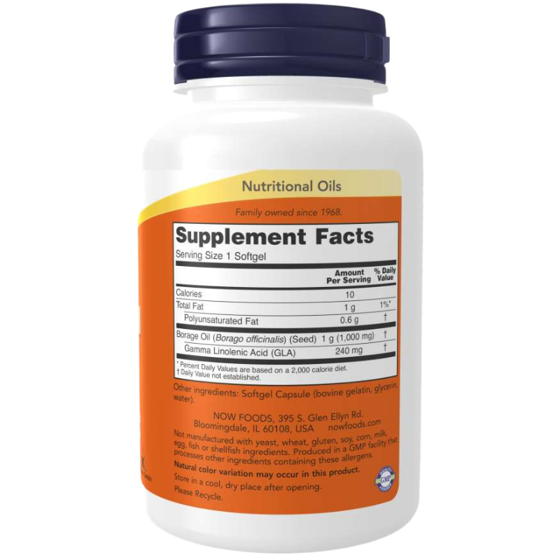 NOW Foods Borage Oil to suplement diety w kapsułkach z czystym olejem z nasion ogórecznika, bogatym w kwas gamma-linolenowy (GLA) – wartościowy składnik tłuszczowy wspierający równowagę kwasów omega i zdrowie skóry, stawów oraz ogólne funkcje organizmu.