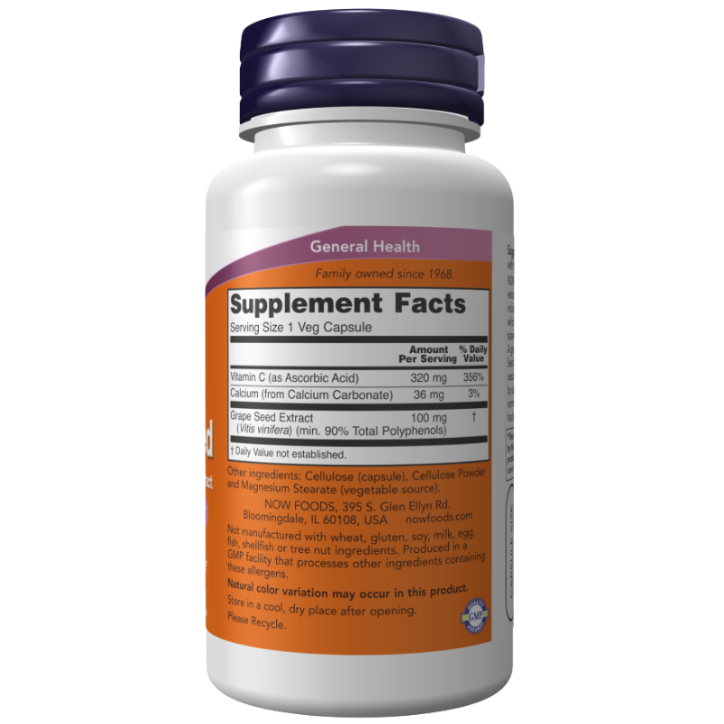 NOW Foods Grape Seed 100 mg to suplement diety zawierający standaryzowany ekstrakt z pestek winogron z minimum 90% polifenoli, który wspiera antyoksydacyjną ochronę komórek, zdrowie naczyń krwionośnych i naturalną odporność.