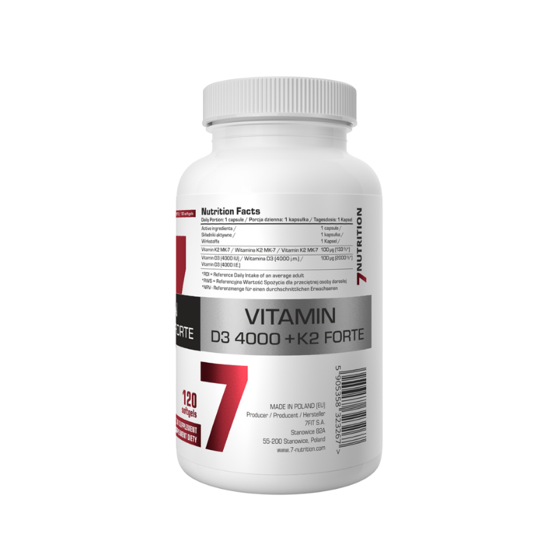 7Nutrition Vitamin D3 4000 K2 Forte to zaawansowany suplement diety w postaci kapsułek miękkich (softgel), łączący dwie witaminy rozpuszczalne w tłuszczach – witaminę D3 oraz witaminę K2 w formie MK-7. Witamina D3 odgrywa istotną rolę w wielu procesach metabolicznych w organizmie, natomiast witamina K2 MK-7 wspiera działania związane z metabolizmem wapnia i prawidłową mineralizacją tkanek. Suplement został wzbogacony o olej MCT z kokosa, który działa jako nośnik poprawiający wchłanianie witamin rozpuszczalnych w tłuszczach.