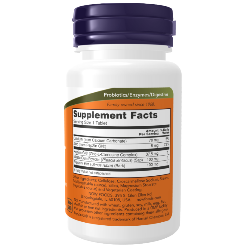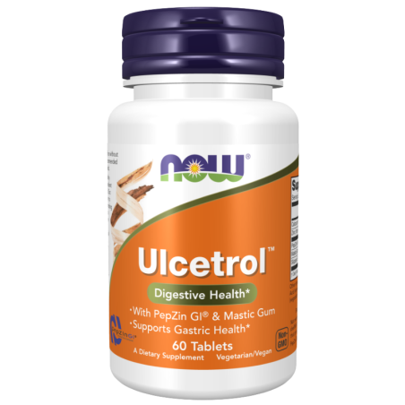 NOW Ulcetrol to suplement diety w formie tabletek zawierający PepZin GI® (kompleks cynku z L-karnozyną) wraz z guma mastyksową i korą wiązu, opracowany, aby wspierać zdrową błonę śluzową żołądka i komfort trawienia.