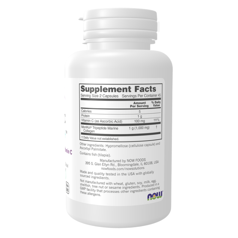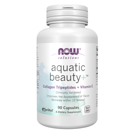 NOW Aquatic Beauty to suplement diety w kapsułkach z tripeptydowym kolagenem morskim i witaminą C, który uzupełnia dietę w składniki wspierające nawilżenie skóry i zdrowy wygląd cery od wewnątrz.