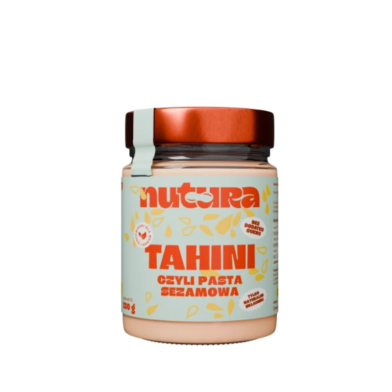 NUTURA Tahini to 100 % naturalna pasta sezamowa z lekko prażonych ziaren sezamu, popularna w kuchniach świata jako kremowy dodatek do potraw, sosów i deserów, która wnosi nutę orzechowej świeżości do codziennych dań.