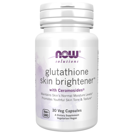NOW Foods Glutathione Skin Brightener to suplement diety łączący glutation z kompleksem fitoceramidów Ceramosides® w wygodnych kapsułkach, wspierający pielęgnację skóry od wewnątrz i jej naturalny blask. Produkt wpisuje się w styl życia osób dbających o równomierny koloryt i nawilżenie skóry.