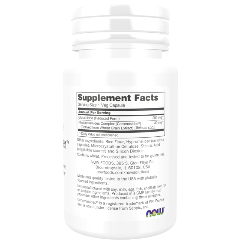 NOW Foods Glutathione Skin Brightener łączy zredukowany glutation z Ceramosides®, czyli ekstraktem bogatym w fitoceramidy pozyskanym z ziaren pszenicy, w wegańskich kapsułkach. Glutation jest antyoksydantem obecnym naturalnie w organizmie, a Ceramosides® to skoncentrowany kompleks fitoceramidów. Produkt został opracowany z myślą o codziennym uzupełnianiu diety osób, które chcą zadbać o wygląd skóry i jej nawilżenie od wewnątrz.