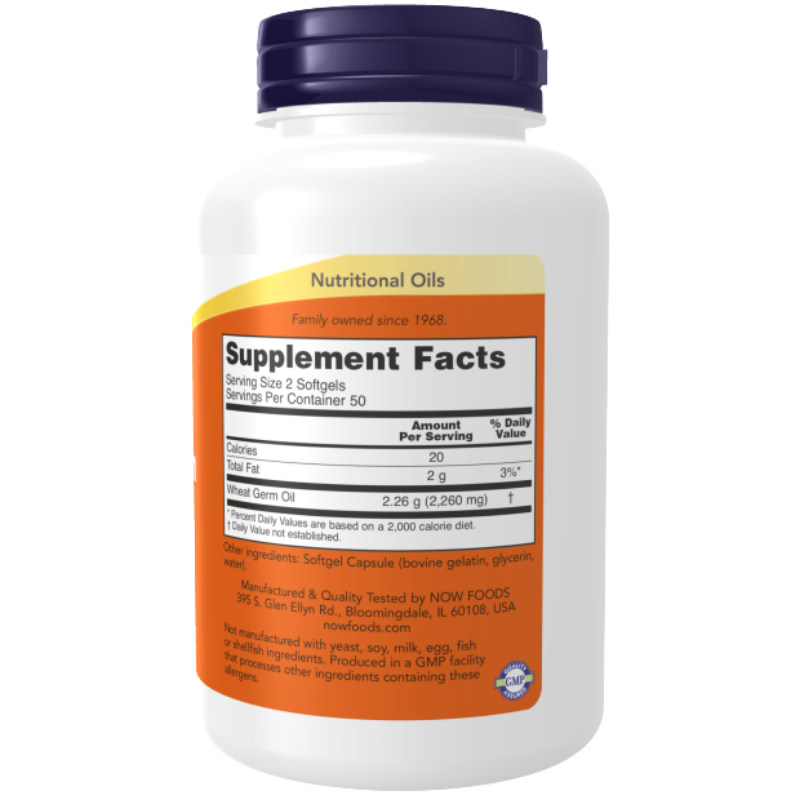 NOW Wheat Germ Oil 100 Softgels to suplement diety z naturalnym olejem z kiełków pszenicy w formie miękkich kapsułek, który ułatwia codzienne uzupełnienie wartościowych tłuszczów roślinnych i witaminy E. Produkt wpisuje się w styl życia osób aktywnych, dbających o zbilansowaną dietę i zdrowe źródła lipidów.