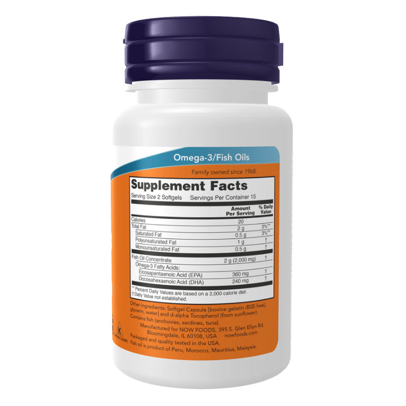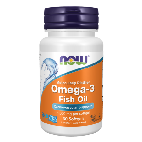 NOW Omega-3 to suplement diety z wysoką zawartością kwasów tłuszczowych EPA i DHA z oleju rybiego, który ułatwia codzienne uzupełnienie niezbędnych tłuszczów omega-3 i wspiera równowagę profilu lipidów w diecie. Produkt świetnie wpisuje się w styl życia osób aktywnych i dbających o bilans tłuszczów roślinnych i morskich.