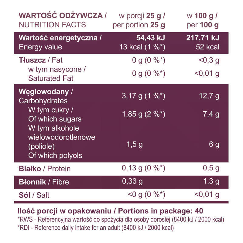 Dżem zawiera aż 80% śliwek, co nadaje mu intensywny, owocowy smak. Słodycz została uzyskana dzięki zastosowaniu erytrytolu i sukralozy. Dodatek cynamonu i goździków podkreśla charakter produktu i nadaje mu wyrazisty aromat. Produkt nie zawiera dodatku cukru, a jedynie naturalnie występujące cukry. Sprawdzi się jako dodatek do deserów, posiłków lub przekąsek.