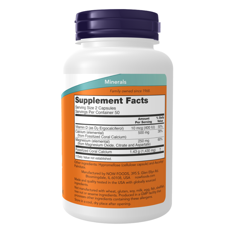 NOW Coral Calcium Plus 1000 mg to suplement diety łączący wapń koralowy z witaminą D oraz minerałami, który ułatwia codzienne uzupełnienie diety w kluczowe składniki mineralne i wspiera naturalną równowagę wapnia w organizmie. Produkt odpowiada potrzebom osób dążących do pełniejszego pokrycia dziennego zapotrzebowania na wapń w praktycznej formie kapsułek.