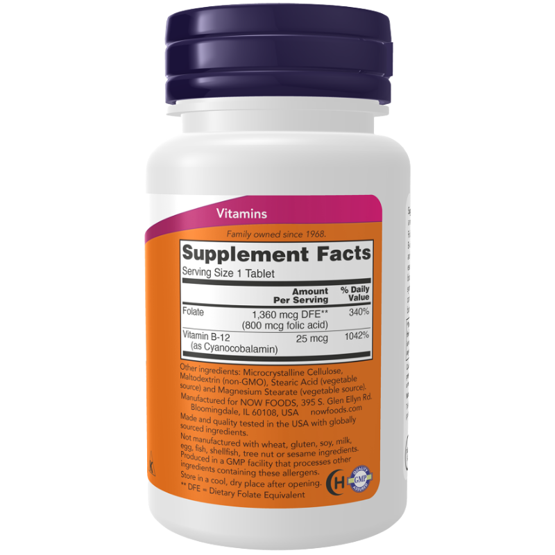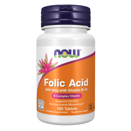 NOW Folic Acid dostarcza 800 mcg kwasu foliowego wraz z witaminą B12 (cyjanokobalaminą) w każdej tabletce, ułatwiając jednoczesne uzupełnienie tych powiązanych witamin z grupy B. Kwas foliowy i witamina B12 biorą udział w naturalnych procesach syntezy DNA i metabolizowaniu aminokwasów oraz wpływają na przemiany energetyczne zachodzące w organizmie. Regularne uzupełnianie tych witamin w codziennej diecie pomaga wspierać naturalne procesy metaboliczne bez konieczności przyjmowania wielu suplementów.