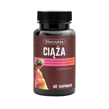 Skoczylas Ciąża to suplement diety łączący kwas foliowy (witaminę B9) z ekstraktem z żurawiny, który ułatwia codzienne uzupełnienie diety w kwas foliowy oraz wartościowe fitozwiązki z owoców żurawiny. Produkt oferuje wygodną formę kapsułek do stosowania w codziennej diecie.