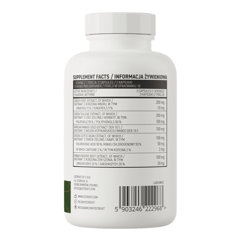 Składniki: ekstrakt z korzenia imbiru (Zingiber officinale rosc.) 5% gingeroli, ekstrakt z liści zielonej herbaty (Camellia sinensis) 50% polifenoli, ekstrakt z nasion afrykańskiego mango (Irvingia gabonensis) DER 10:1, ekstrakt z ziaren zielonej kawy (Coffea arabica) 50% kwasu chlorogenowego oraz 2% kofeiny, ekstrakt z korzenia żeń-szenia (Panax ginseng) 20% ginsenozydów, otoczka kapsułki (hydroksypropylometyloceluloza).