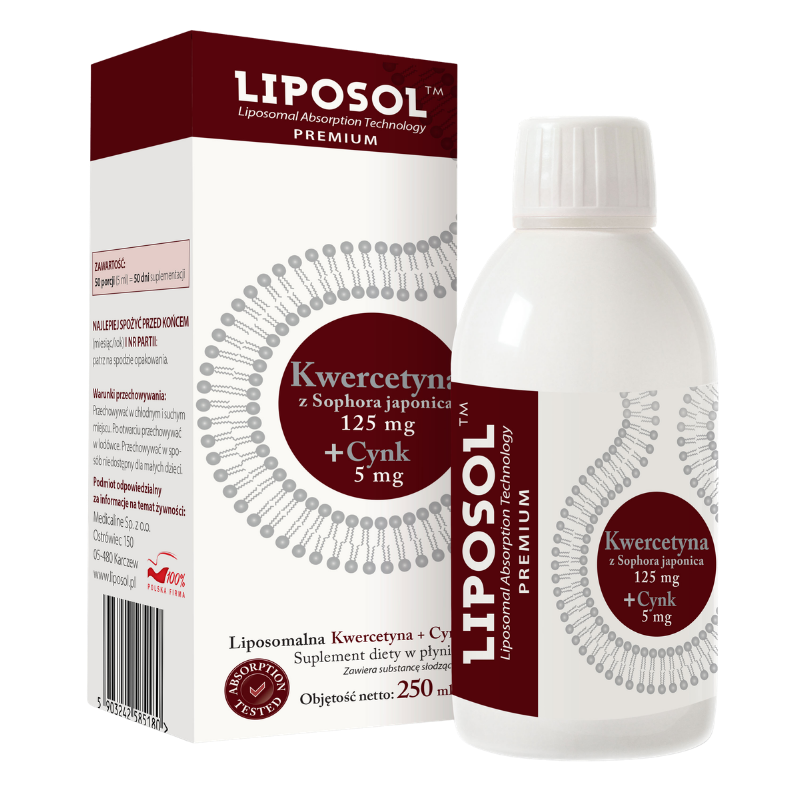Aliness Liposol Liposomalna Kwercetyna 250 ml zawiera kwercetynę pozyskiwaną z perełkowca japońskiego oraz cynk, zamknięte w liposomach, które chronią składniki przed rozkładem i zwiększają ich przyswajalność. Technologia liposomalna umożliwia efektywniejszy transport substancji aktywnych do komórek, co przekłada się na ich lepsze wykorzystanie w organizmie. Cynk bierze udział w funkcjonowaniu układu odpornościowego i procesach metabolicznych, natomiast kwercetyna dostarcza silnych związków o działaniu antyoksydacyjnym.