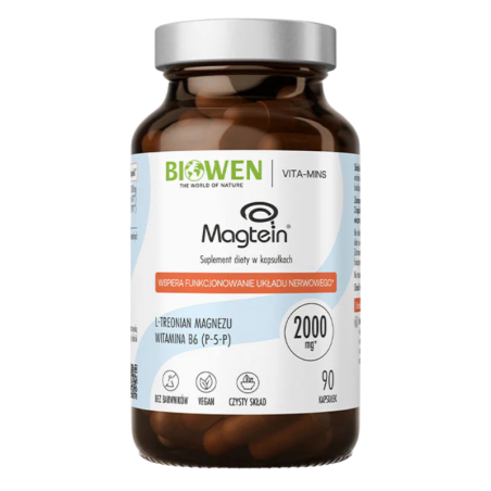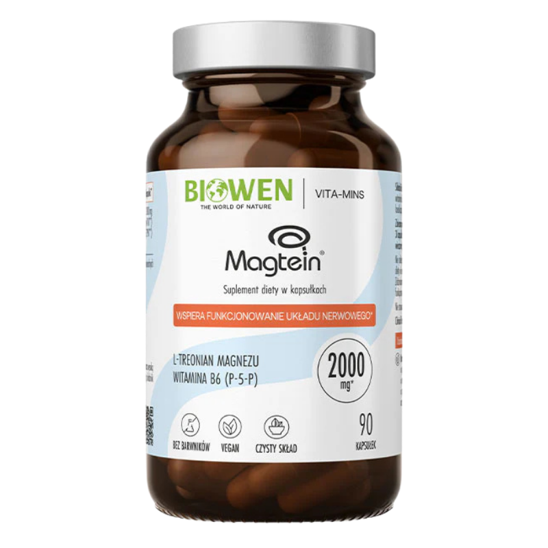 Biowen Treonian Magnezu Magtein® dostarcza opatentowaną formę magnezu – Magtein® (L-treonian magnezu), która została opracowana z myślą o skutecznym wykorzystaniu w organizmie, w tym w obrębie układu nerwowego. Magnez uczestniczy w procesach przewodnictwa nerwowego, pracy mięśni i metabolizmie energetycznym, natomiast witamina B6 (P-5-P) wspiera funkcje psychologiczne i redukcję zmęczenia. Połączenie tych składników wspiera koncentrację, regenerację układu nerwowego oraz równowagę psychofizyczną.