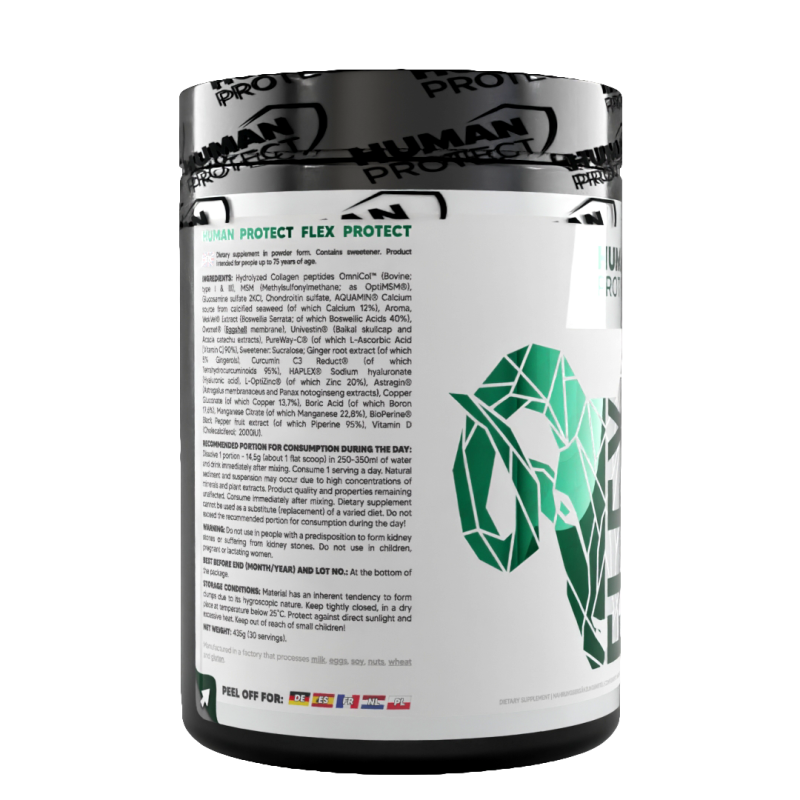 Human Protect Flex Protect to zaawansowana formuła wspierająca aparat ruchu oparta na wielowarstwowej architekturze działania. Formuła składa się z 19 składników aktywnych, w tym 12 opatentowanych surowców i ponad 14,5 g aktywnych substancji w porcji.