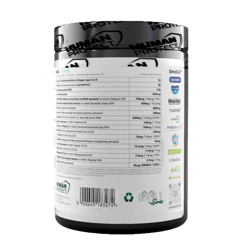 SKŁADNIKI: hydrolizowane peptydy kolagenu OmniCol™ (wołowy, typ I i III), MSM (metylosulfonylometan OptiMSM®), siarczan glukozaminy 2KCl, siarczan chondroityny, Aquamin® (źródło wapnia ze zwapniałych wodorostów), aromat, ekstrakt Boswellia serrata (WokVel®), Ovomet® (błona skorupki jaj), Univestin® (tarczyca bajkalska i akacja katechu), PureWay-C® (witamina C), substancja słodząca: sukraloza, ekstrakt z imbiru, Curcumin C3 Reduct®, HAPLEX® (kwas hialuronowy), L-OptiZinc®, AstraGin®, glukonian miedzi, kwas borowy, cytrynian manganu, BioPerine® (ekstrakt pieprzu czarnego), witamina D3.