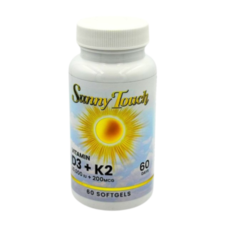 Sunny Touch D3 10 000 IU + K2 200 mcg to suplement diety łączący wysoką dawkę witaminy D3 z aktywną formą witaminy K2, wspierający odporność i zdrowie kości. Produkt wyróżnia się wysoką biodostępnością i naturalną formułą w kapsułkach softgel.