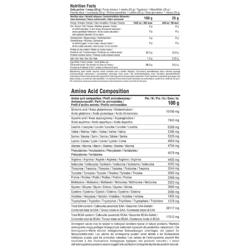 Składniki: izolat białka jaj 98%, emulgator: lecytyny (ze słonecznika). |